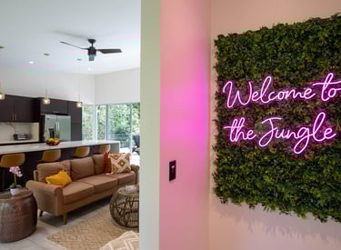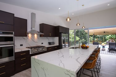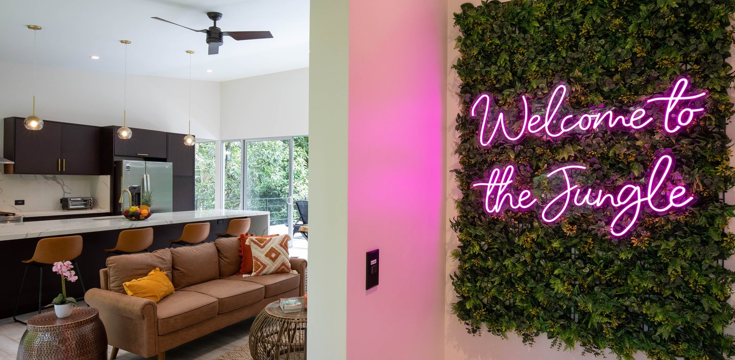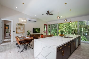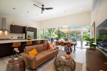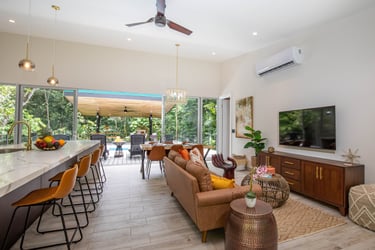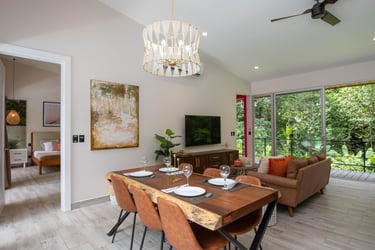 Watch your kids play in the pool, or the monkeys climb in the trees, while you have coffee in your luxury chef's kitchen, with oversized island, wood slab table, and comfortable furniture. We can help coordinate a private chef to cook for your family, or help yourself with all the tools you'd expect in a top of the line home kitchen. Wall of glass on both sides brings the outdoors inside
