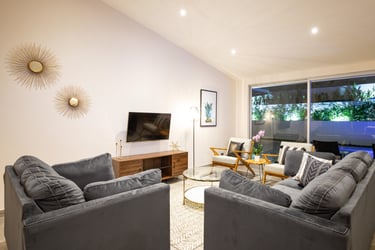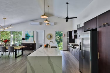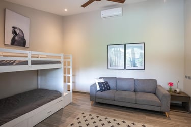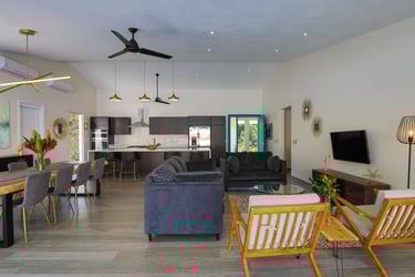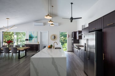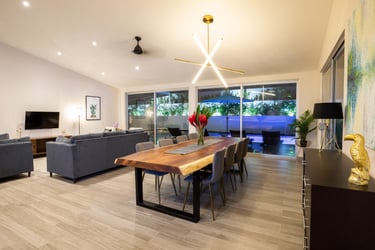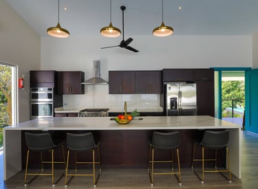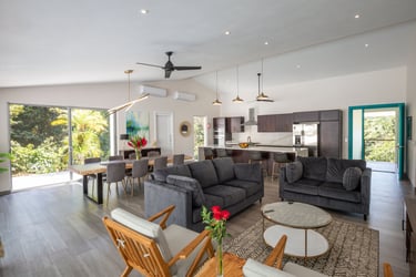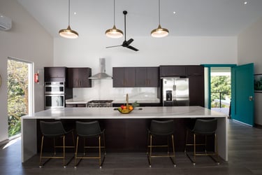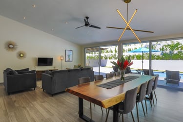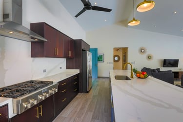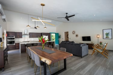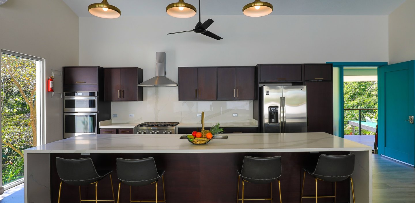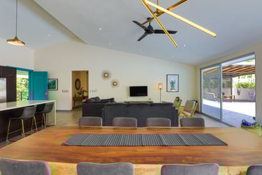 Watch your kids play in the pool, or the monkeys climb in the trees, while you have coffee in your luxury chef's kitchen, with oversized island, wood slab table, and comfortable furniture. We can help coordinate a private chef to cook for your family, or help yourself with all the tools you'd expect in a top of the line home kitchen.