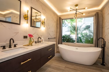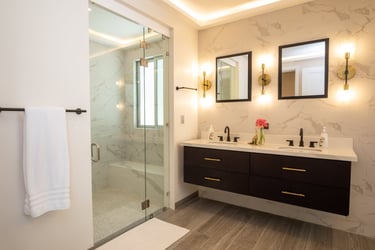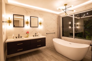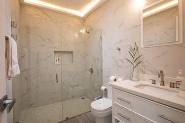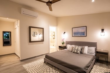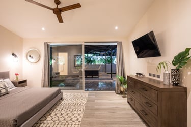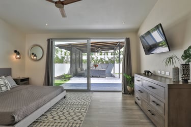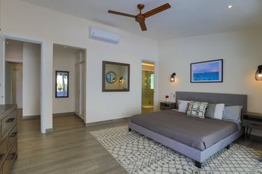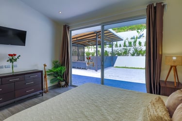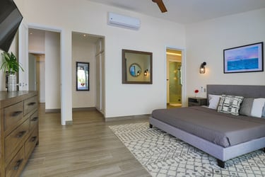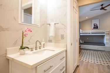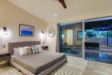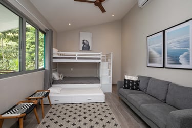 3 Luxuriously appointed bedrooms for 7 people: 1) King Master with En Suite Bath and Shower, 2) Bedroom with Bunk + Trundle with En Suite Bath/Shower combo, and 3) King with easy access to Walk in Shower. King Bedrooms have Pool Access from bedrooms,